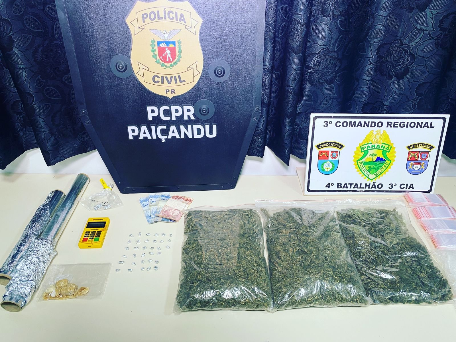 Investigadores da polícia civil e os policiais militares, foram até o local e encontraram cerca de 1kg de maconha, pedras de crack, pinos para vender cocaína, dinheiro em espécie e máquina de cartão.