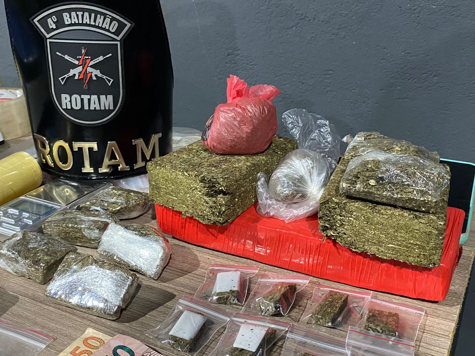 Os policiais ao verificar o local indicado, foi encontrada 874g de maconha, 6 buchas de cocaína, balança de precisão e dinheiro em espécie.