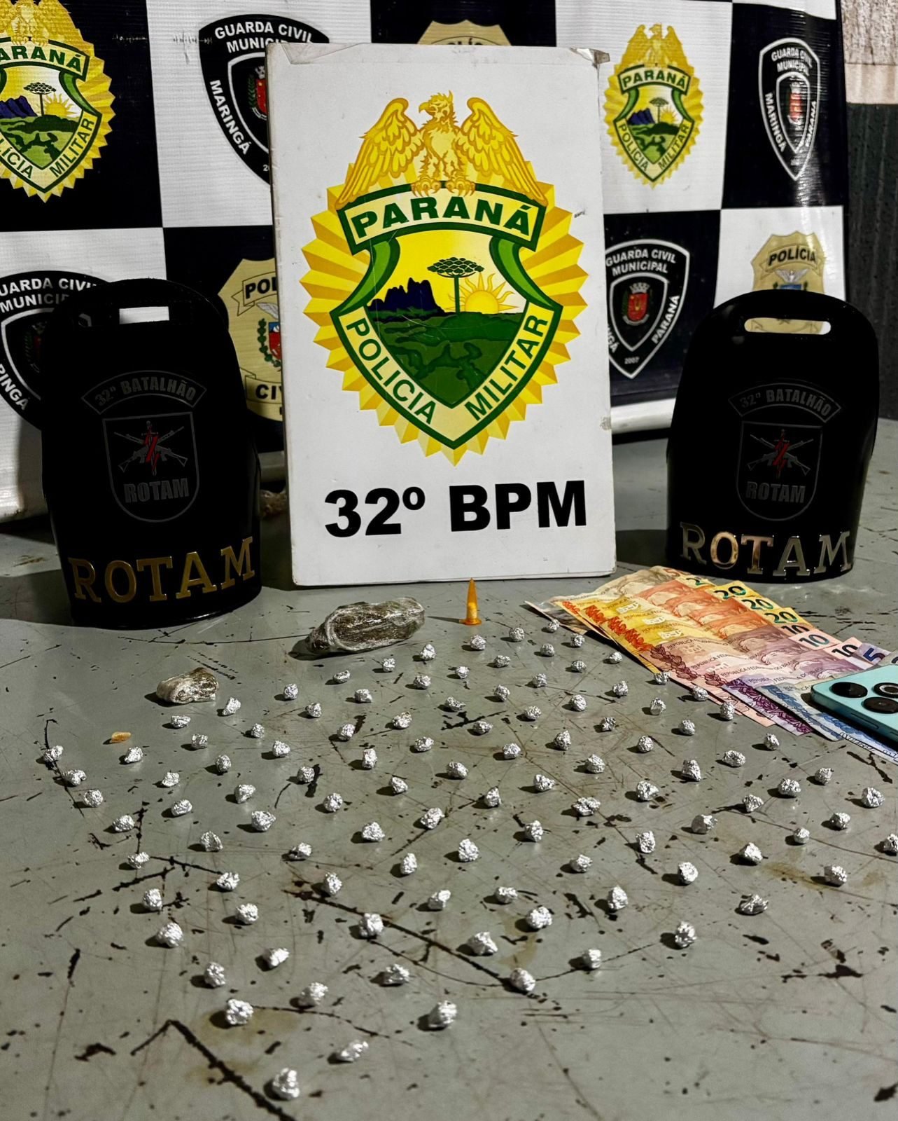 Além dos itens encontrados com o suspeito, parte da droga estava escondida em um terreno ao lado do bar. No total, foram apreendidos: