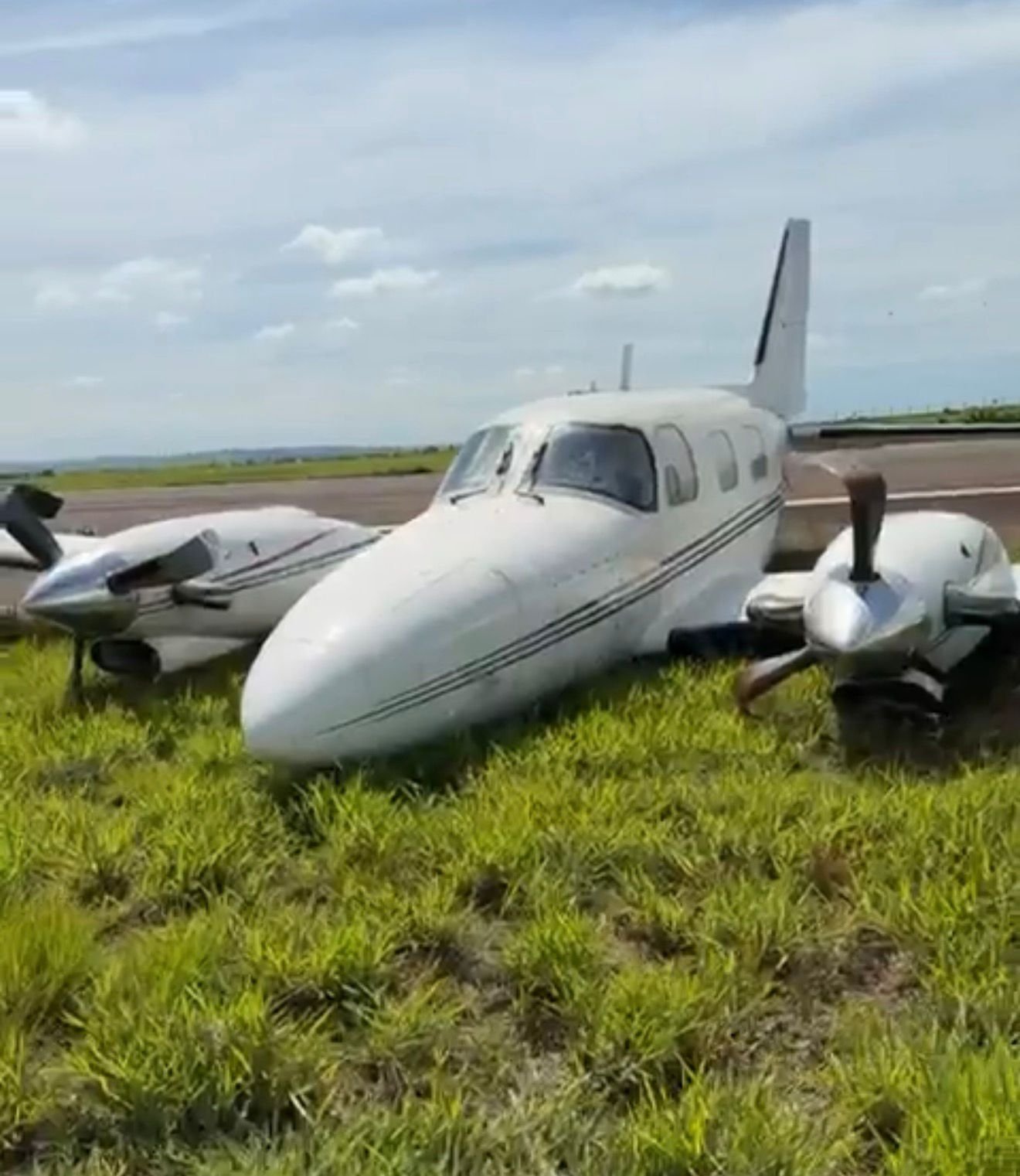De acordo com as informações apuradas, a aeronave, um bimotor, tentou pousar quando acabou saindo da pista. Durante a manobra, as hélices chegaram a atingir o solo.