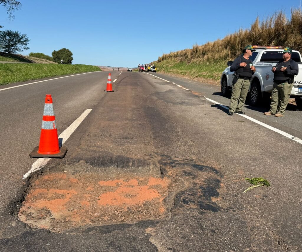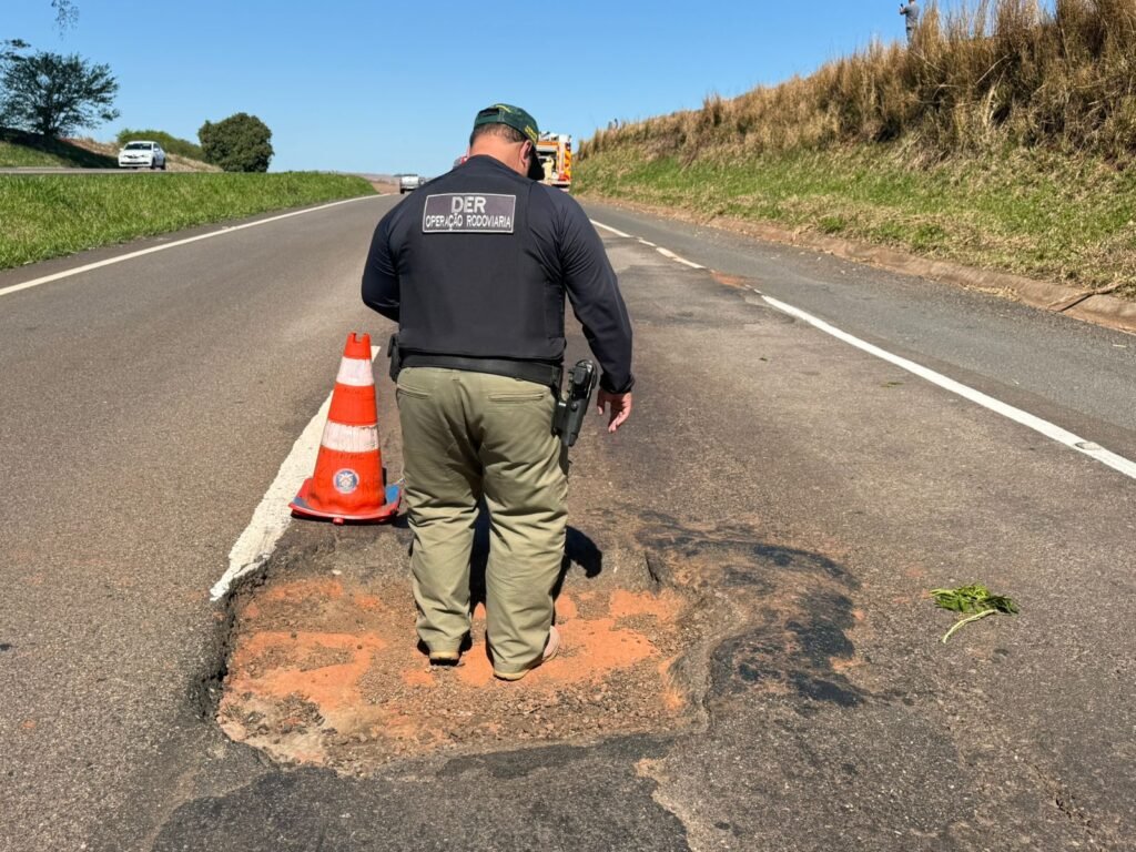 A Polícia Rodoviária Estadual e o Departamento de Estradas de Rodagem (DER) estiveram no local, sinalizando a via e o buraco para evitar novos acidentes.