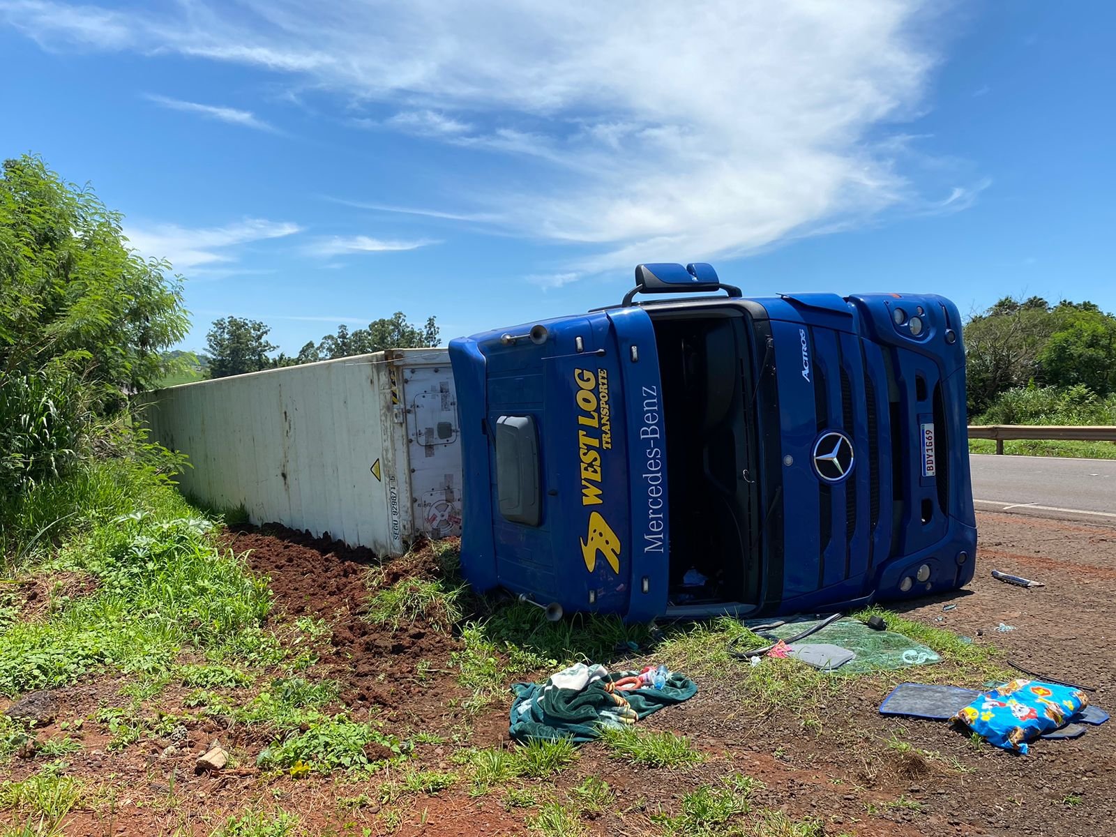 Início » Caminhoneiro fica ferido após carreta carregada com morangos tombar na PR-323 em Água Boa