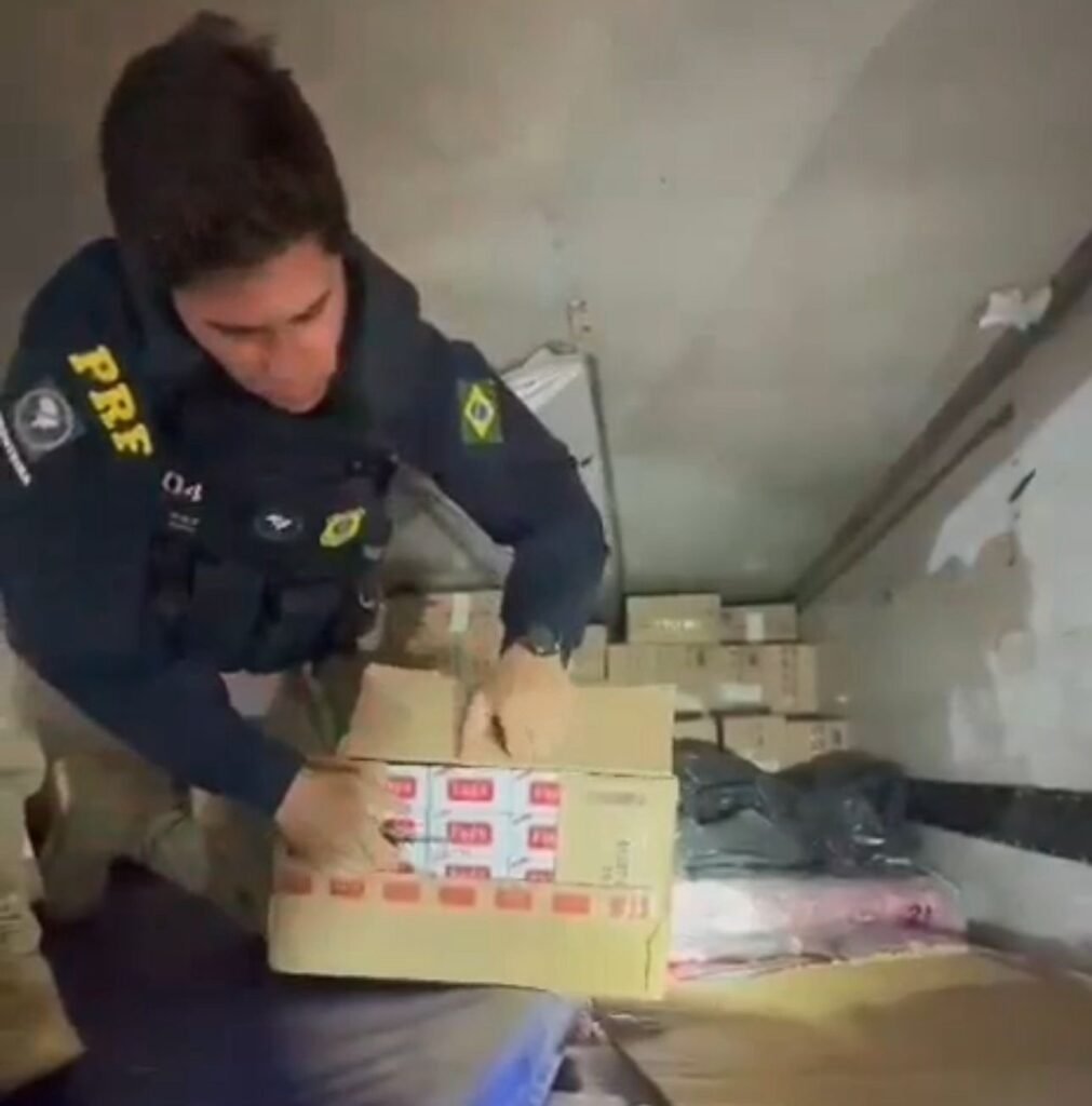 Durante a abordagem, o motorista alegou inicialmente que transportava macarrão. No entanto, ao abrirem o compartimento de carga, os agentes constataram que o veículo estava carregado com 150 mil pacotes de cigarros contrabandeados do Paraguai, distribuídos em 300 caixas.