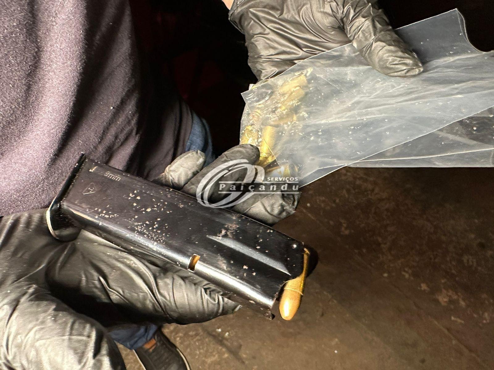 Próximo do veículo, foi encontrado um galão e um isqueiro. No interior do veículo, foram localizados estojos de revólver calibre 38.
