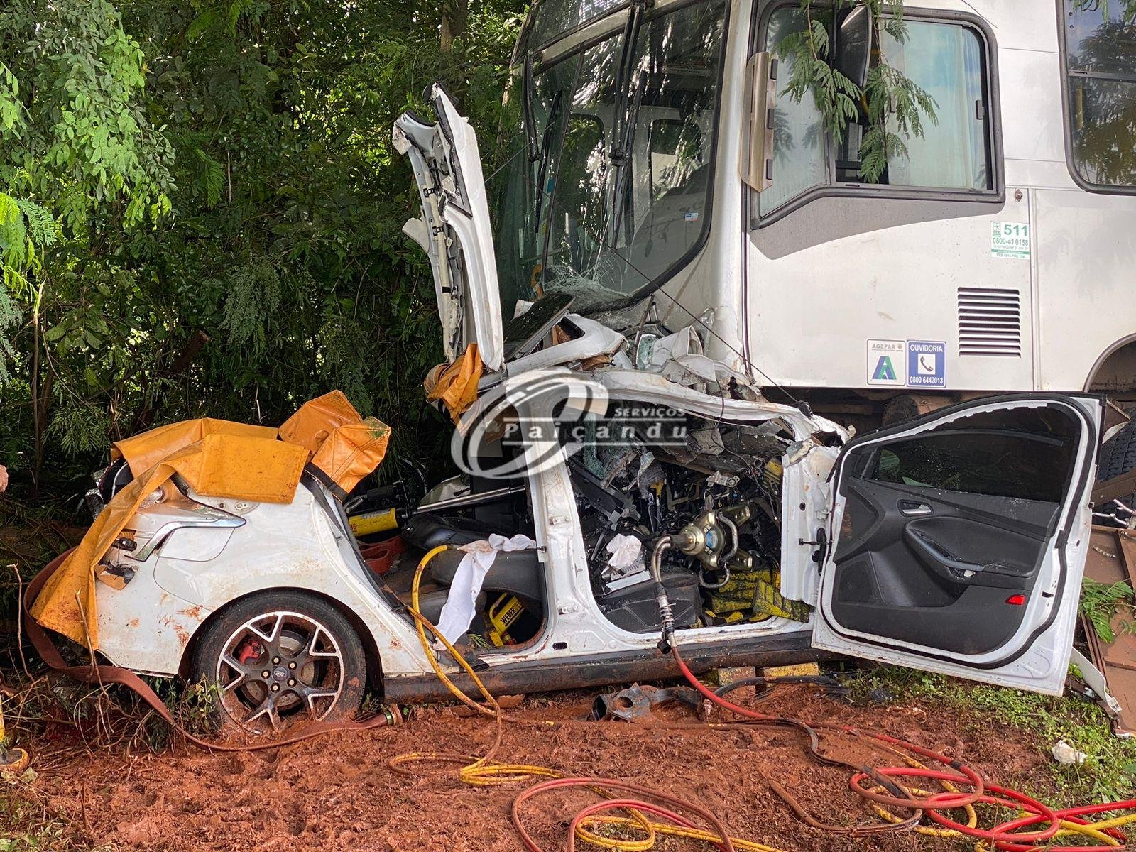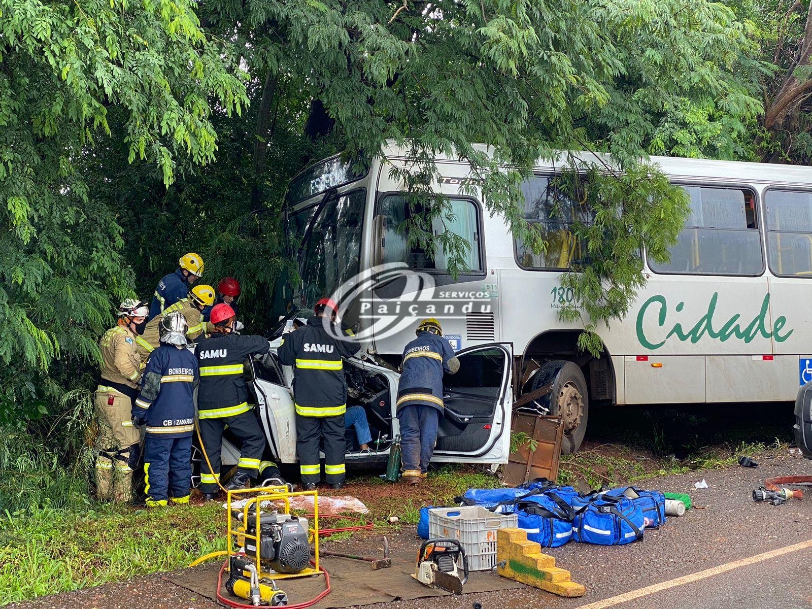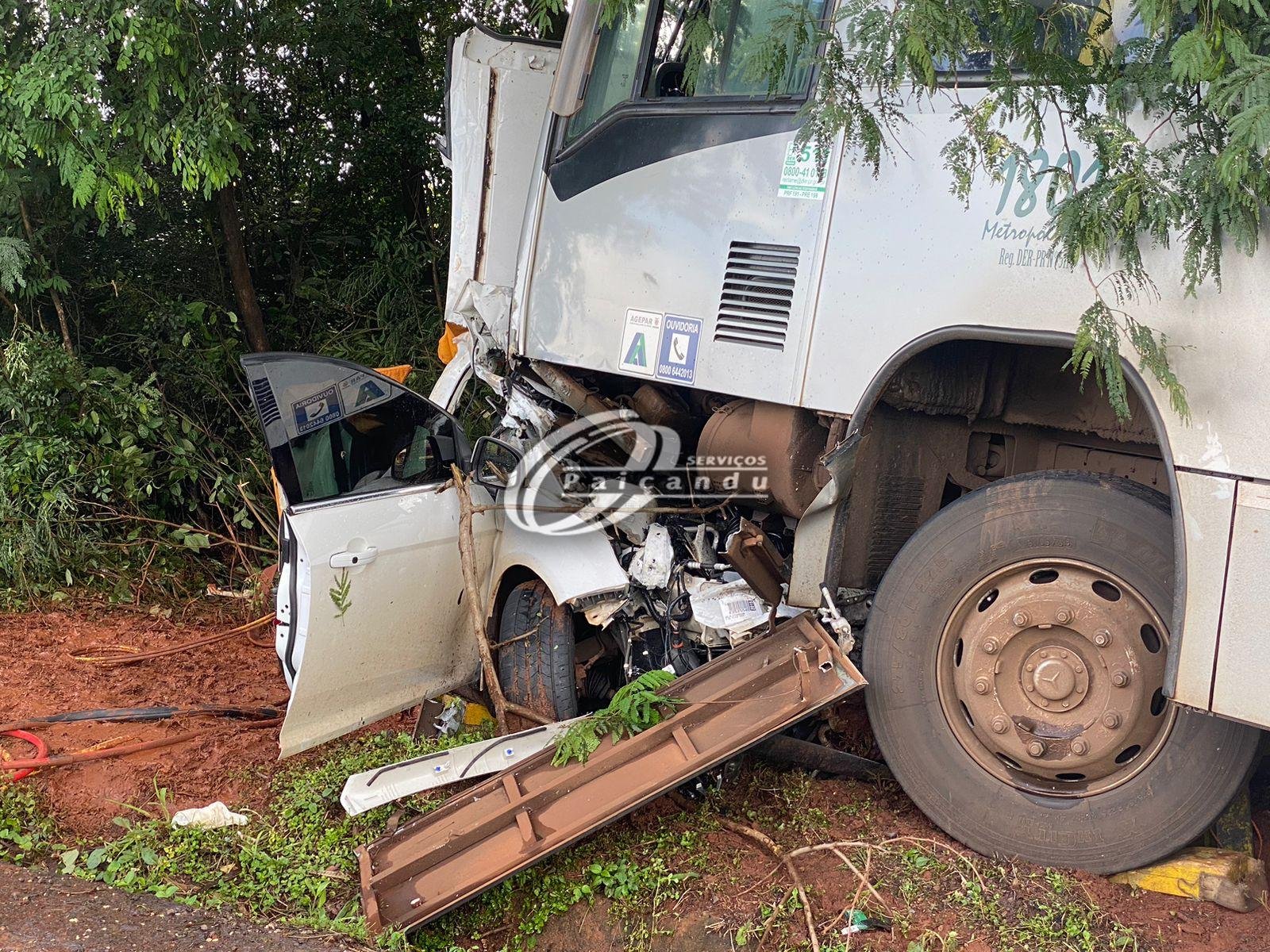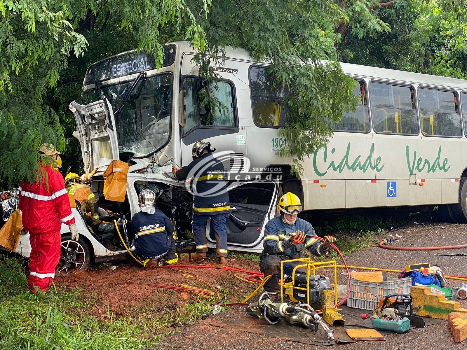 O carro colidiu frontalmente com um ônibus da empresa Transporte Metropolitano Cidade Verde. O carro ficou destruído.