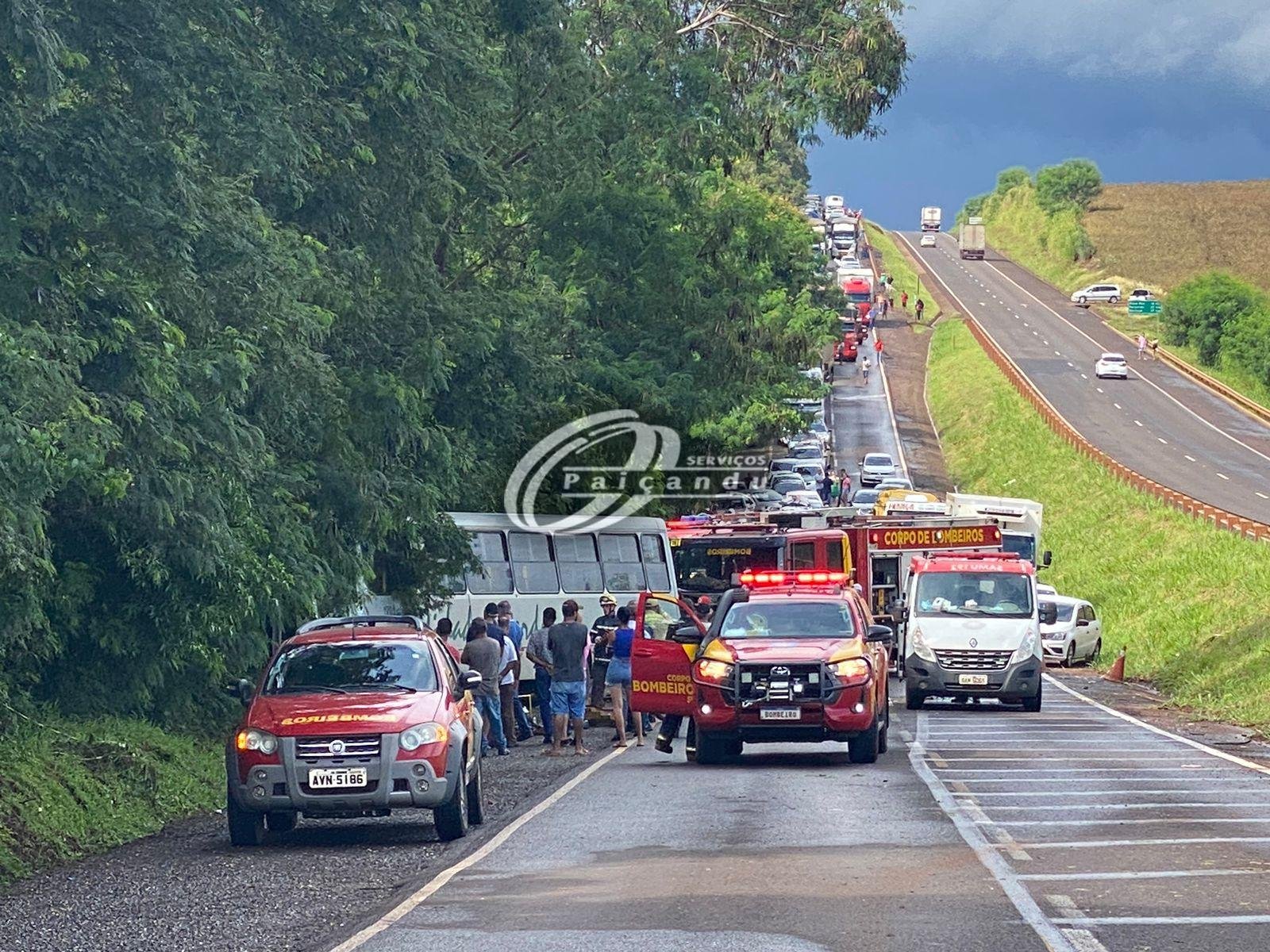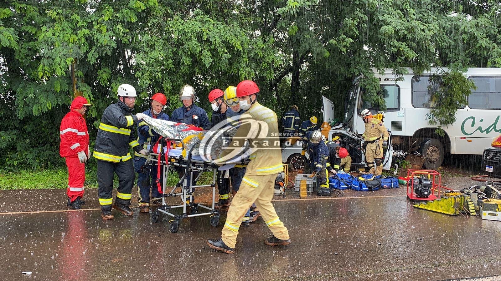 Colisão frontal entre ônibus e carro deixa casal ferido na PR-323 em Doutor Camargo. O motorista precisou ser entubado no local