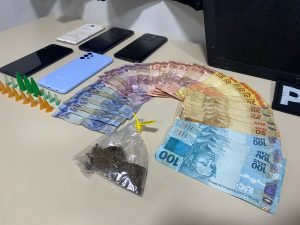 Foram apreendidos mais de 150 pinos com cocaína, dinheiro oriundo do tráfico, celulares, balança de precisão e dezenas pinos vazios.