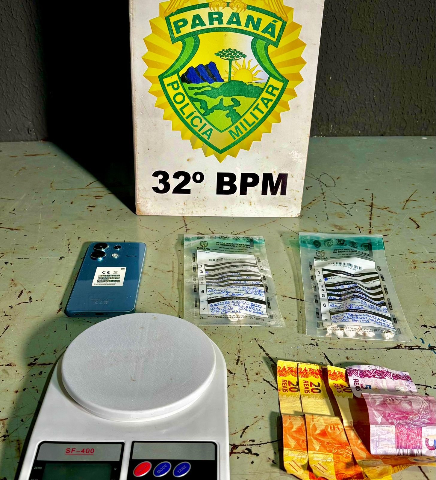 A ação resultou na apreensão de 12 porções de cocaína, R$ 65,00 em dinheiro, uma balança de precisão e um celular, além da prisão de um homem e a condução de outro para a delegacia para as providências cabíveis.