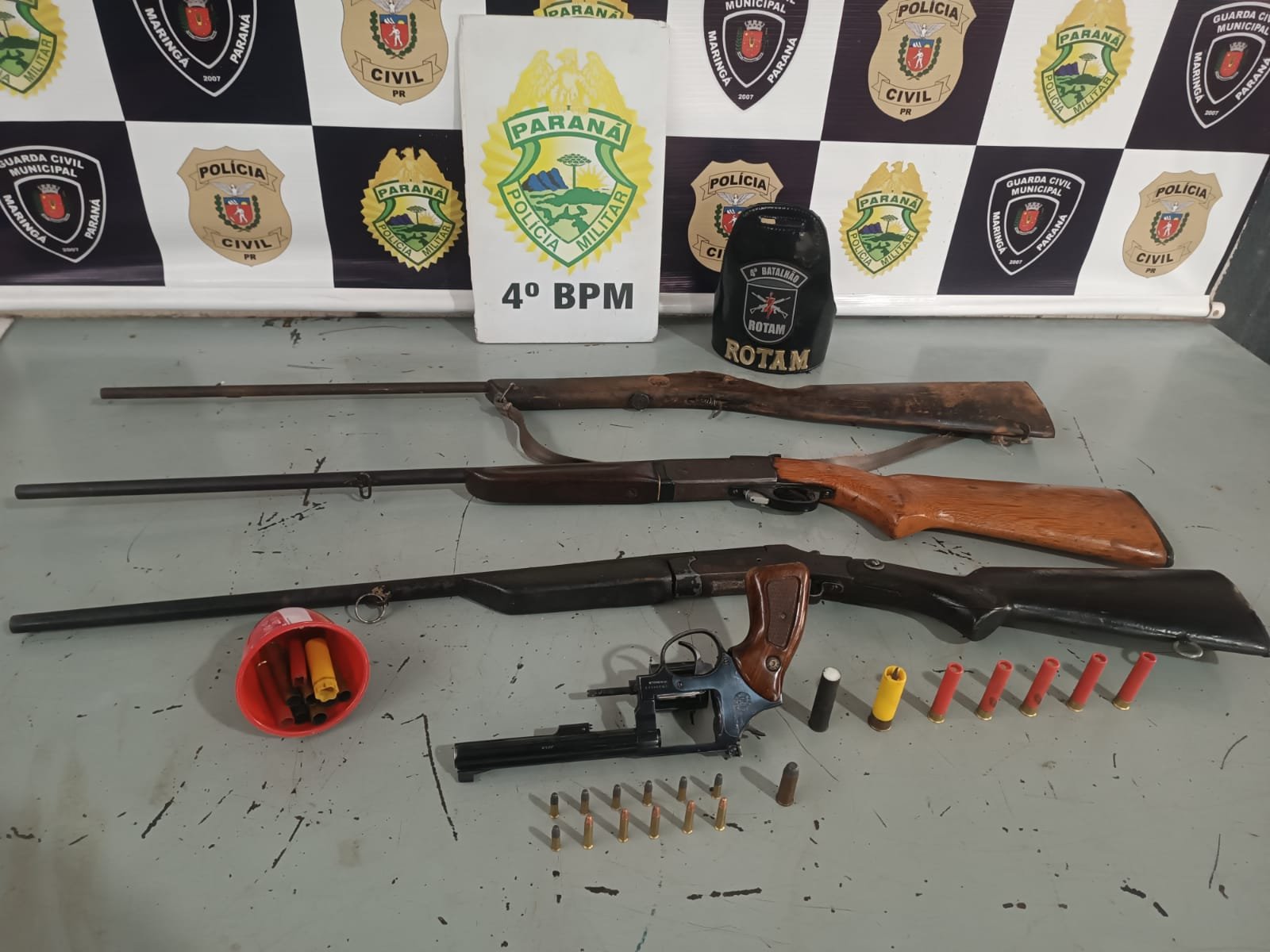 A equipe da ROTAM realizou a prisão de um homem por posse de arma de fogo em Paiçandu. De acordo com a PM, os policiais ao atender uma ocorrência onde o denunciante relatava que um morador da área rural da cidade, estaria realizando disparos e arma de fogo, a equipe logrou êxito em apreender um revólver, três espingardas e munições.
