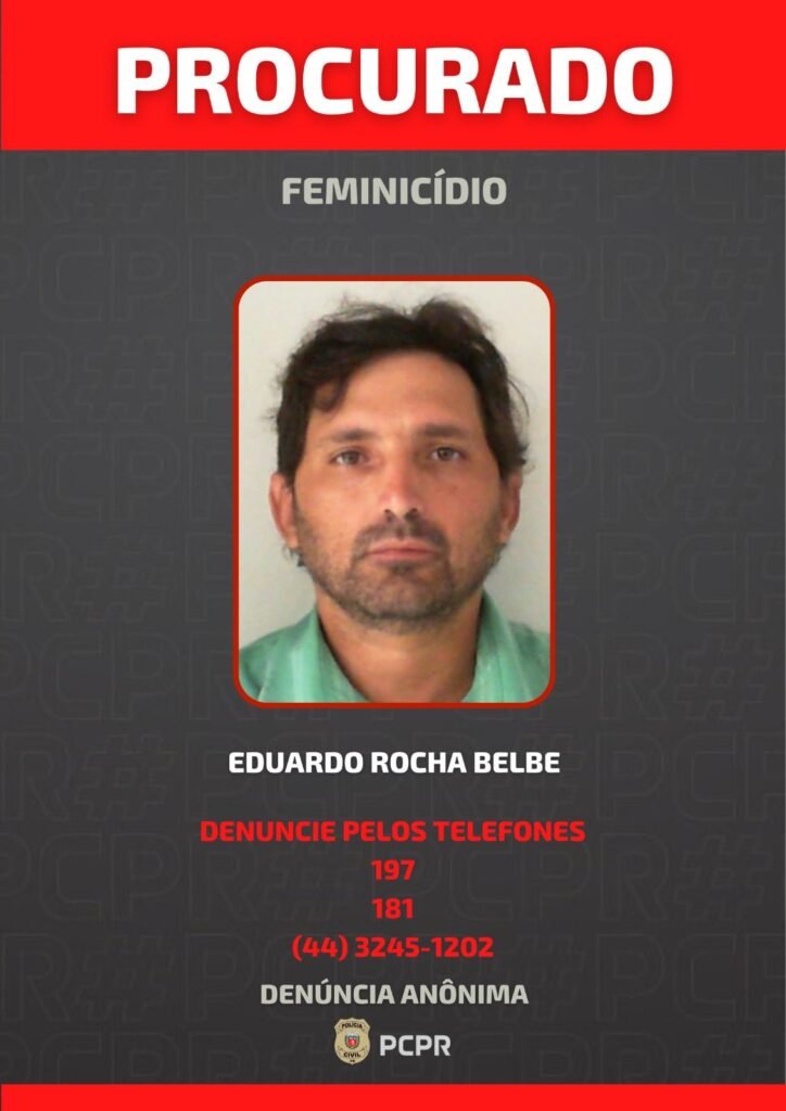 A Polícia Civil do Paraná divulgou a foto de Eduardo Rocha Belbe, procurado pelo crime de feminicídio ocorrido no último dia 21 de abril, em Mandaguaçu.