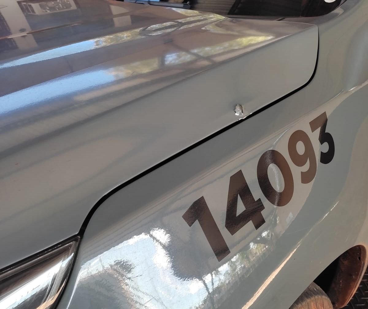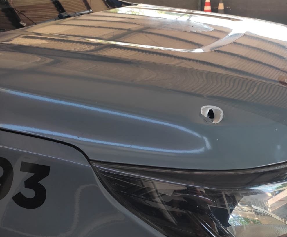A viatura ocupada pelos policiais foi atingida por disparos realizados pelo suspeito durante o confronto.