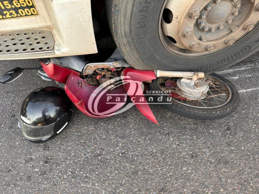 A motoneta chegou a ser arrastada pelo veículo ficando prensada nos rodados da carreta.