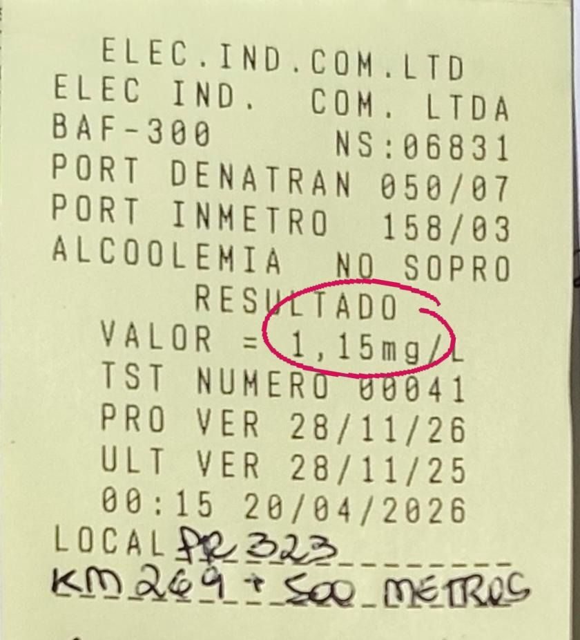 Diante da situação, os policiais deram ordem de parada, que foi acatada. Durante a abordagem, o motorista — que conduzia uma Ford Ranger, com placas de Tuneiras do Oeste — apresentava sinais visíveis de embriaguez. Ele foi submetido ao teste do etilômetro, que apontou 1,15 mg/L de álcool por litro de ar alveolar.