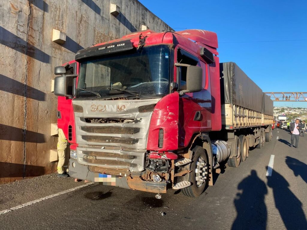Um grave acidente de trânsito foi registrado na manhã desta quinta-feira (31) no Contorno Norte de Maringá, nas proximidades do Jardim Império do Sol. A colisão envolveu uma carreta e um carro de passeio, que ficou com a parte traseira completamente destruída após o impacto.