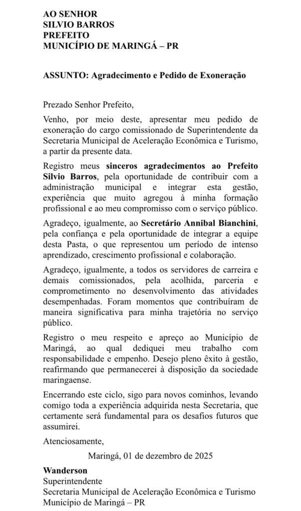 O superintendente da Secretaria Municipal de Aceleração Econômica e Turismo de Maringá, Wanderson Carlos da Silva , apresentou oficialmente, nesta segunda-feira (1º de dezembro), seu pedido de exoneração do cargo comissionado que ocupava na administração municipal.