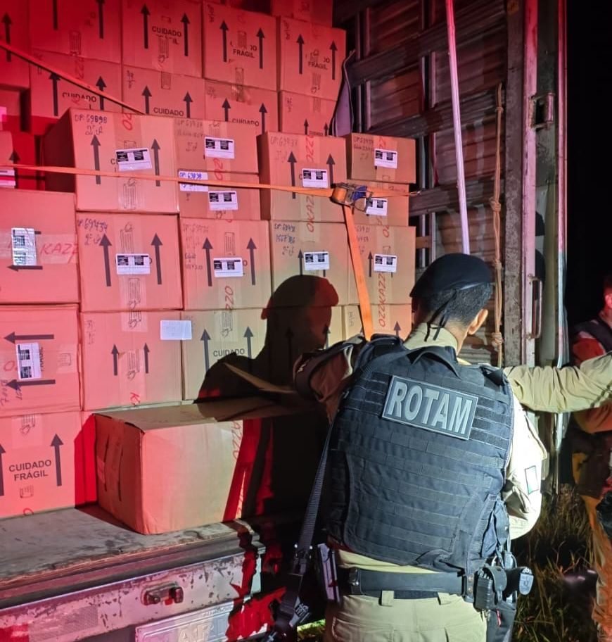 Com base nas informações repassadas, as equipes iniciaram patrulhamento e localizaram o caminhão em deslocamento pela região, seguindo no sentido Sabáudia. A abordagem foi realizada com apoio de outras viaturas. No interior da cabine, os policiais encontraram um equipamento utilizado para bloqueio de sinal de rastreamento.