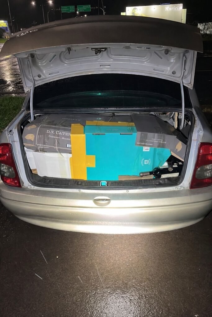 Ao todo, foram apreendidas 111 garrafas de vinho, 49 caixas de vinho e duas garrafas de azeite. O veículo utilizado no transporte também foi apreendido. A carga foi avaliada em aproximadamente R$ 40 mil.