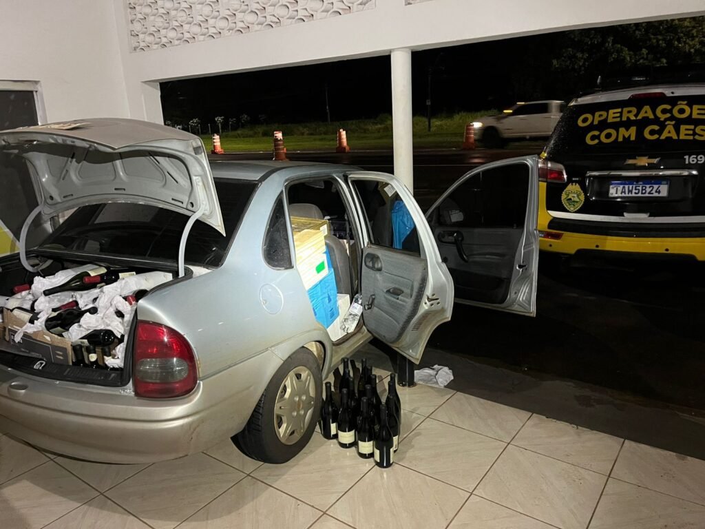 A equipe da Operação com Cães da 4ª Cia realizava fiscalização de rotina quando abordou um veículo GM/Corsa Classic. Durante a vistoria, foram localizadas diversas caixas e garrafas de vinho, além de azeite, todos sem o devido desembaraço aduaneiro, caracterizando, em tese, o crime de descaminho.
