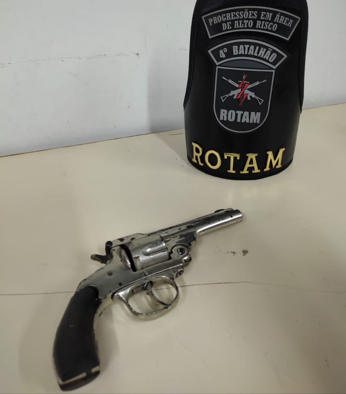Após receber um denúncia, via 190, de que um homem estaria portando uma arma de fogo em um bar, a equipe da ROTAM foi verificar, e os policiais lograram êxito em localizar um revólver e realizar a prisão de um suspeito. O jovem tentou correr e dispensar a arma, mas foi contido pela equipe policial e encaminhado a delegacia para procedimentos cabíveis.