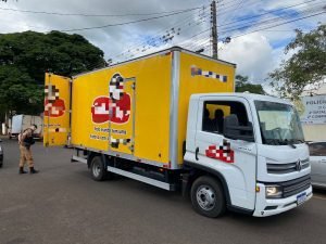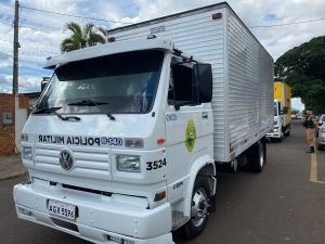 No momento da abordagem o grupo de pessoas realizavam o carregamento do cigarro em um caminhão adesivado com logo de empresa de salgadinhos e com placas adulteradas.