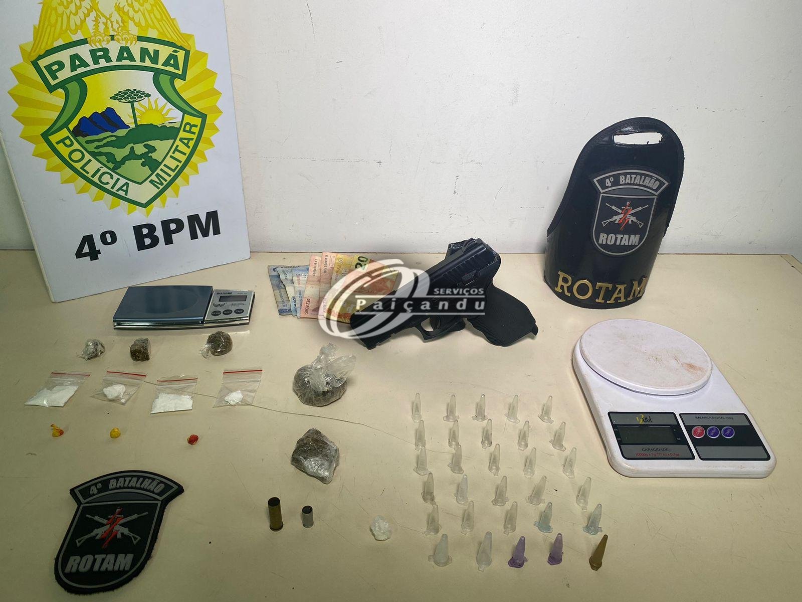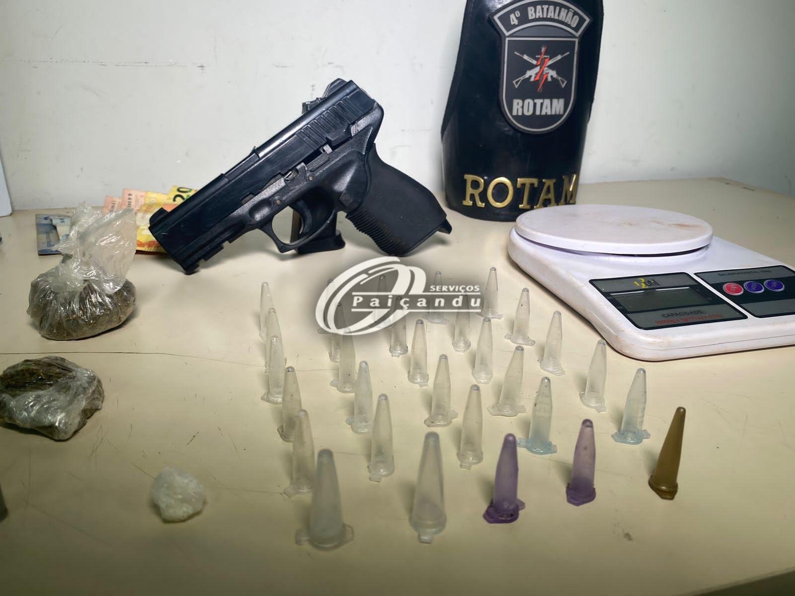Com os suspeitos foram encontrados substância análoga à cocaína e maconha. Na residência dos acusados os policiais encontraram mais do entorpecentes, pinos para venda de cocaína, balança de precisão, maquininha de cartão e um simulacro.