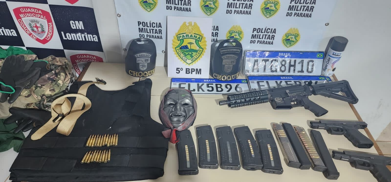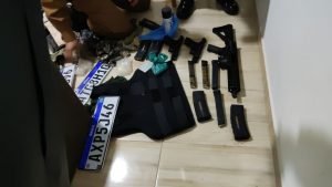 No momento da abordagem, os suspeitos ocupavam o Fiat Siena prata, que foi visto trafegando na rodovia juntamente com o Siena preto. No carro nada de ilícito foi localizado. Porém em ato contínuo a abordagem, em uma chácara, os policiais militares lograram êxito na localização, de um fuzil calibre 556, duas pistolas calibre 09 milímetros, um colete balístico, diversos carregadores, munições, placas automotivas – inclusive uma delas com os mesmos dados da placa do carro encontrado queimado e máscaras.